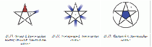 Ad Abbildung 14: Hier wirkt innerhalb des Kucheneckes ein Runenzeichen interna, die Wirkung des Runenzeichens wirkt nur innerhalb der Teilform Kucheneck und nicht auf die Gesamtform Kreis, da es durch die begrenzende Funktion der Linie daran gehindert wird, in die anderen Kuchenecke zu gelangen. Ad Abbildung 15: Diese Abbildung wirkt parallel zu Abbildung 14, wenngleich es sich nicht um ein Kucheneck sondern um ein Dreieck als Teilform des Pentagramms handelt. Nun zwei abschließende Betrachtungen zu den Wirkungsweisen von Runenzeichen innerhalb eines Pentagramms: